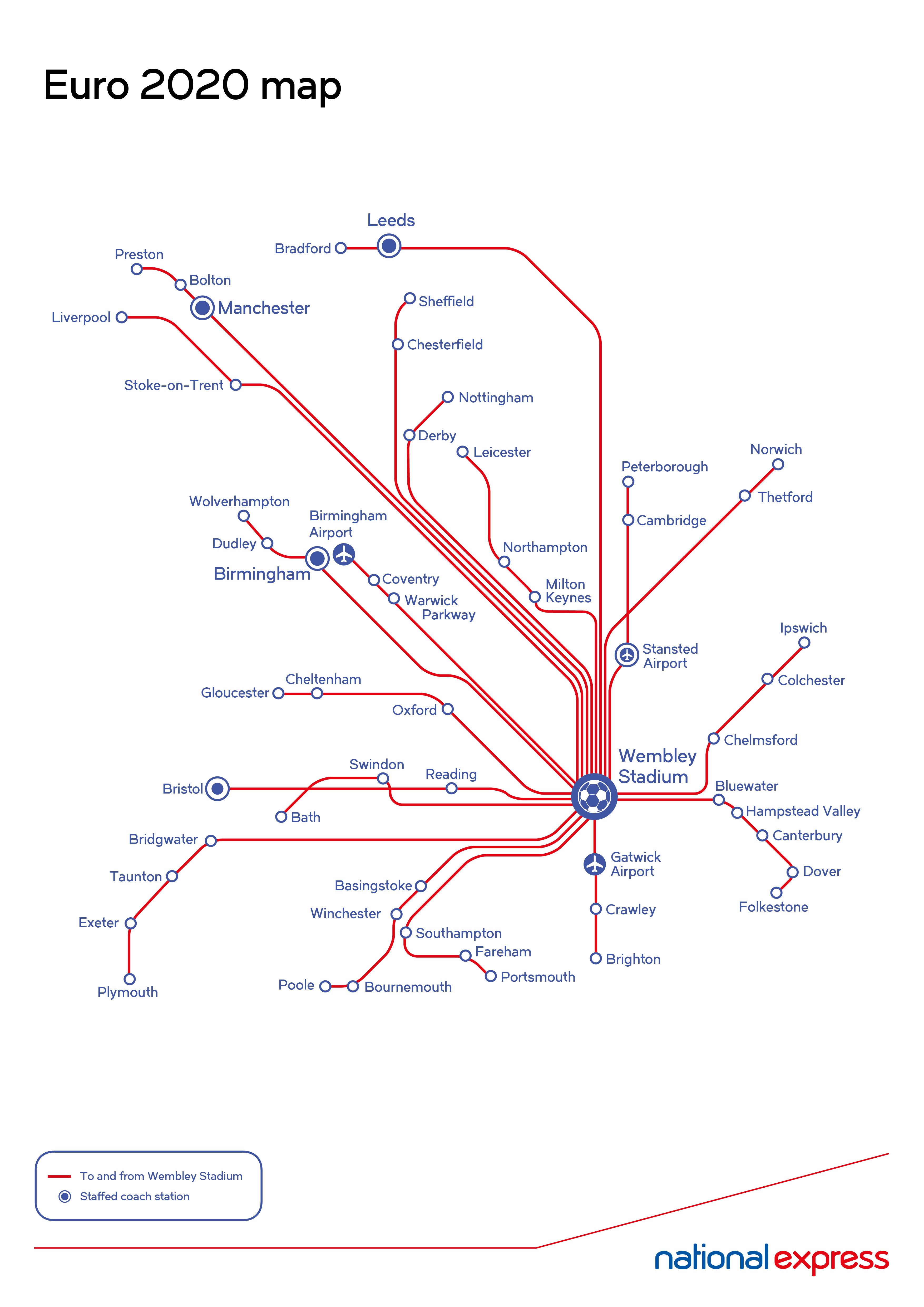 As the official coach supplier to Wembley Stadium connected by EE, National Express can take you directly to UEFA EURO 2020.